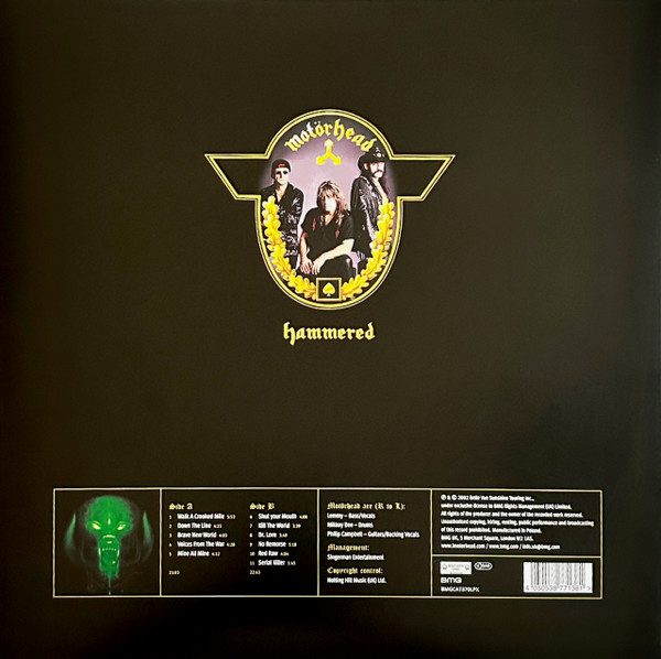 »Hammered« er Motörheads 16. studiealbum, indspillet i Hollywood med Mikkey Dee på trommer, Phil Campbell på guitar og Lemmy på vokal og bas. For resten betyder albummets titel “at være fuldstændig fuld”.